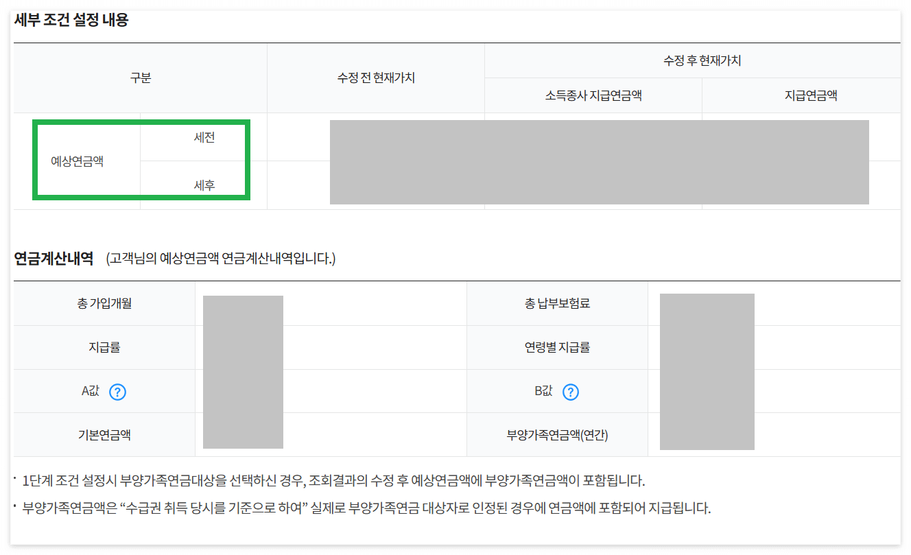 부양가족, 출생 자녀수, 월평균 소득, 연금 개시 기간을 입력하라는 화면이 나옵니다. 본인의 상황에 맞는 숫자 및 금액을 입력하고 나면 최종적으로 예상 수령액을 아래와 가티 확인할 수 있습니다.